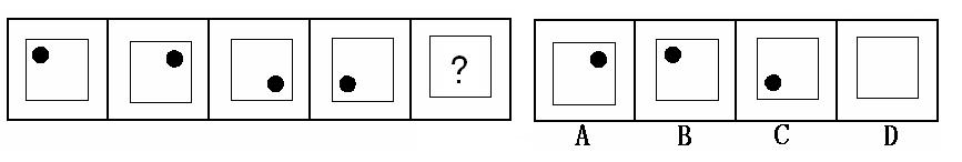 (答案:B。黑點(diǎn)在正方形中順時針移動。在第5個圖形中,應(yīng)該正好移動到左上角。)