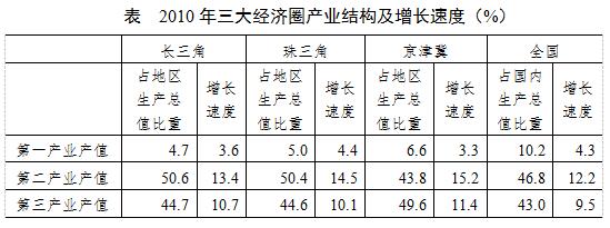 三大經(jīng)濟(jì)圈中,2010年三次產(chǎn)業(yè)增長(zhǎng)速度均超過(guò)全國(guó)平均水平的有幾個(gè)?