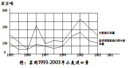 1.從1993年到1997年中,該國(guó)共從亞洲國(guó)家進(jìn)口多少小麥(百萬(wàn)噸)?( )