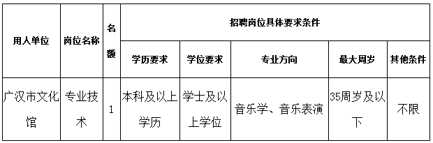 根據(jù)《關于事業(yè)單位招聘藝術專業(yè)技術人員的意見》(川人發(fā)〔2007〕43號)和《關于進一步規(guī)范事業(yè)單位工作人員和機關工勤人員招聘工作的通知》(德人社〔2013〕5號)等文件規(guī)定,經(jīng)研究決定,廣漢市文廣局下屬事業(yè)單位市文化館擬面向社會公開考核招聘1名工作人員,現(xiàn)將有關事項公告如下: