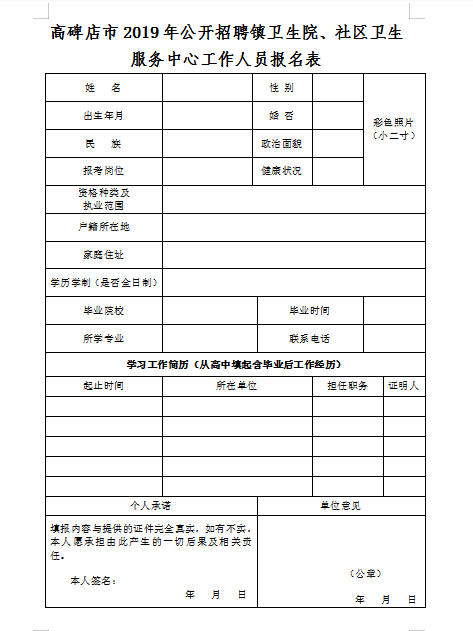 2、《高碑店市2019年公開招聘鎮(zhèn)衛(wèi)生院、社區(qū)衛(wèi)生服務(wù)中心工作人員報名表》