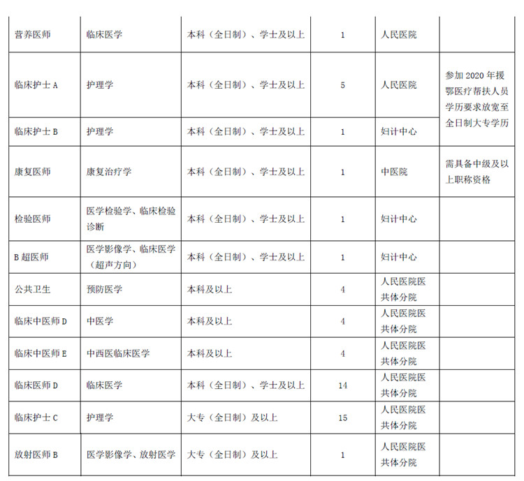4、執(zhí)業(yè)資格要求:2020年全日制普通高校應(yīng)屆畢業(yè)生暫不作執(zhí)業(yè)資格要求;2019年全日制普通高校醫(yī)學(xué)類畢業(yè)生除護理學(xué)專業(yè)要求具備執(zhí)業(yè)護士資格證書外,其他專業(yè)暫不作執(zhí)業(yè)資格要求;2019年前全日制普通高校醫(yī)學(xué)類畢業(yè)生須取得相應(yīng)執(zhí)業(yè)資格。其中中醫(yī)院康復(fù)醫(yī)師崗位需具備相應(yīng)中級或中級以上職稱資格。