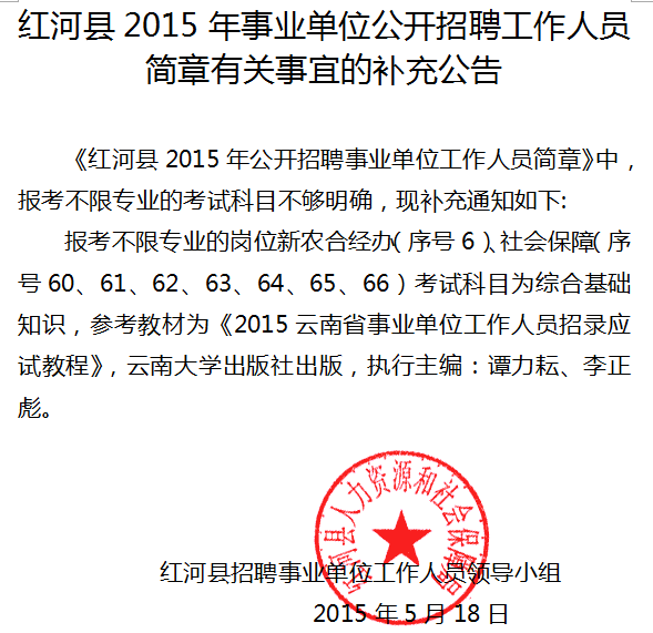 原標(biāo)題:紅河縣2015年事業(yè)單位公開招聘工作人員補充公告
