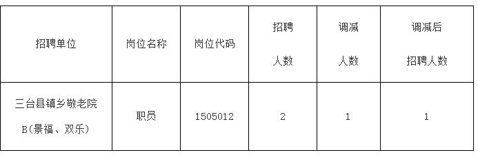 按照三臺(tái)縣人力資源和社會(huì)局《關(guān)于2015年上半年事業(yè)單位公開(kāi)招聘工作人員的公告》,2015年上半年事業(yè)單位公開(kāi)招聘工作人員繳費(fèi)已結(jié)束。根據(jù)報(bào)名繳費(fèi)情況,經(jīng)研究,決定調(diào)減、取消部分崗位招聘計(jì)劃?,F(xiàn)公告如下: