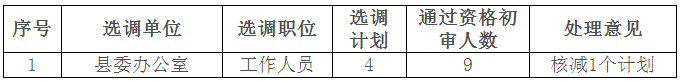 根據(jù)《2015年肥東縣直機關(guān)面向全縣公開選調(diào)公務(wù)員(工作人員)公告》,筆試最低開考比例為3:1,因部分職位報考人數(shù)不足,經(jīng)研究決定,核減以下職位的招考計劃。