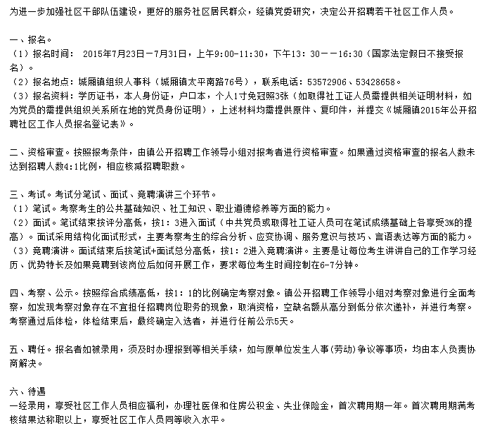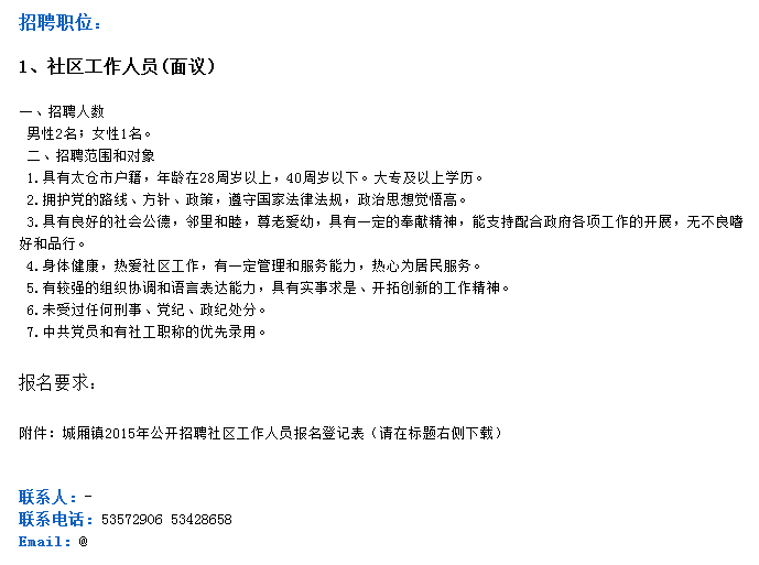 2015江蘇太倉市城廂鎮(zhèn)社區(qū)人員3人公告