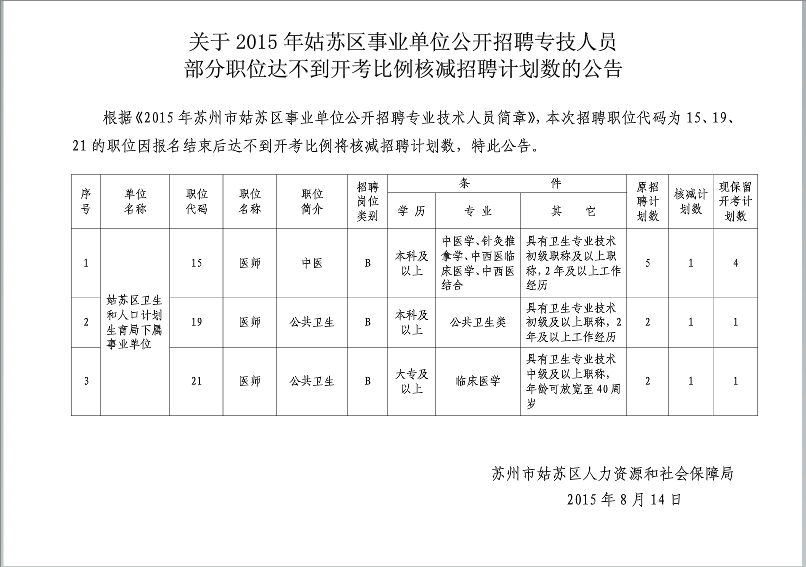2015江蘇姑蘇區(qū)事業(yè)單位招聘專技人員職位達(dá)不到開考比例核減招聘計(jì)劃數(shù)公告