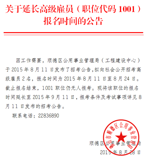 2015廣東佛山市順德區(qū)公用事業(yè)管理局招聘高級雇員(職位代碼1001)延長報名時間公告