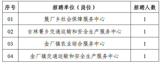 2015年我縣鄉(xiāng)鎮(zhèn)事業(yè)單位面向全省統(tǒng)一選聘、在我縣任滿兩個(gè)聘期的大學(xué)生村官招聘4名工作人員,具體崗位如下: