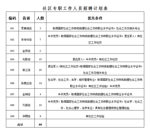 面向社會(huì)招聘社區(qū)專(zhuān)職工作人員89人,具體招聘計(jì)劃見(jiàn)下表: