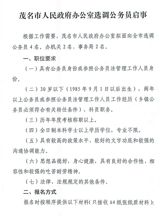 2015廣東茂名市府辦選調(diào)公務(wù)員4人公告