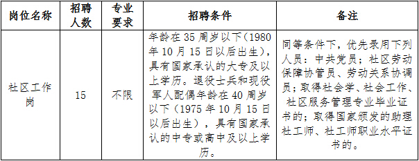 本次共計(jì)招聘15名社區(qū)工作人員。詳見(jiàn)下表: