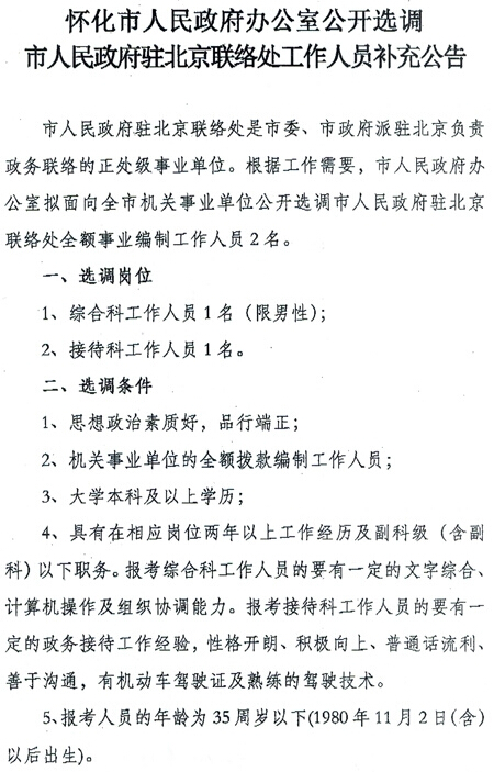2015湖南懷化市人民政府辦公室選調(diào)市人民政府駐北京聯(lián)絡處人員補充公告
