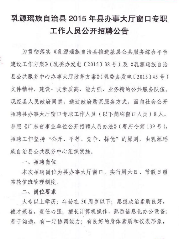 2015廣東乳源縣辦事大廳窗口專職人員招聘公告【招8人】