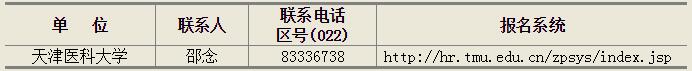 應(yīng)聘人員請登陸天津醫(yī)科大學(xué)網(wǎng)站(www.tmu.edu.cn)“二?一六年公開招聘”專欄,進(jìn)入指定報名系統(tǒng),按照系統(tǒng)提示提交報名材料。具體聯(lián)系方式如下: