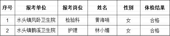 根據(jù)《2015年平陽縣醫(yī)療衛(wèi)生單位公開招聘工作人員公告》(平衛(wèi)發(fā)〔2015〕105號(hào))文件規(guī)定,現(xiàn)將平陽縣醫(yī)療衛(wèi)生事業(yè)單位公開招聘工作人員補(bǔ)檢(當(dāng)時(shí)處于妊娠期,胸透項(xiàng)目未檢)結(jié)果予以公布如下: