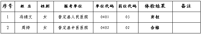 備注:普定縣面向社會公開招聘衛(wèi)生專業(yè)技術(shù)人員復檢或補檢合格人員進入考察環(huán)節(jié),棄權(quán)人員取消考察資格。