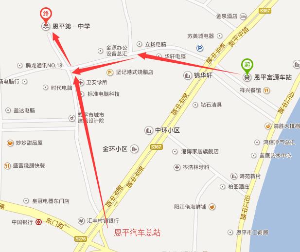 二、考生要盡量選擇乘坐公共交通工具赴考,外地考生可坐車至“恩平富源車站”或“恩平汽車總站”赴考,下車后步行500米或轉(zhuǎn)乘其它公共交通工具路線如下: