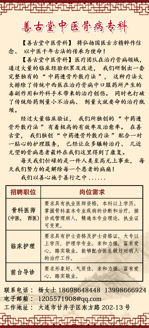 2016遼寧大連善古堂中醫(yī)診所招聘公告