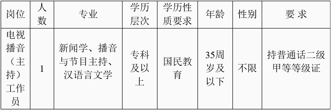 經(jīng)寧洱縣文體廣電旅游局研究,報(bào)寧洱縣人民政府、普洱市人力資源和社會(huì)局批準(zhǔn),2016年寧洱縣廣播電視臺(tái)公開招聘電視播音(主持)工作人員1名,現(xiàn)將公開招聘的有關(guān)事項(xiàng)公告如下: