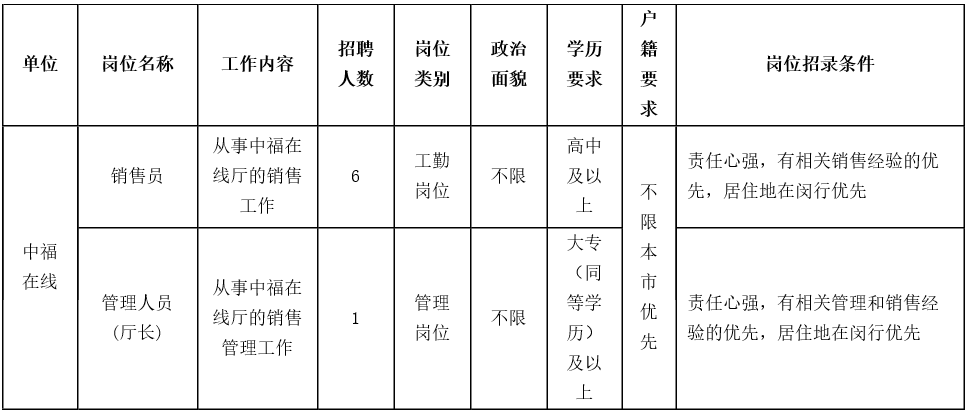 閔行區(qū)福利彩票服務(wù)中心中福在線廳銷售員6名、管理人員1名。