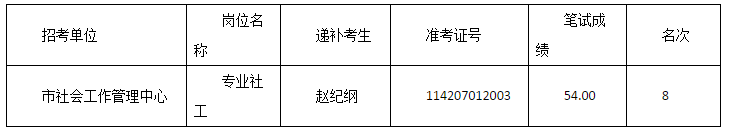 鄂州市民政局系統(tǒng)2016年事業(yè)單位公開招聘資格復(fù)審,因第4名考生向前放棄資格復(fù)審,根據(jù)《鄂州市事業(yè)單位2016年度公開招聘工作人員公告》有關(guān)規(guī)定,在報(bào)考同一崗位考生中按照筆試成績從到低分依次遞補(bǔ)的原則,遞補(bǔ)以下考生為資格復(fù)審人選:
