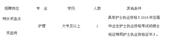 為滿足響水采血點業(yè)務(wù)發(fā)展需要,經(jīng)研究決定,面向社會公開招聘編外合同制護理人員。現(xiàn)將有關(guān)事項公告如下: