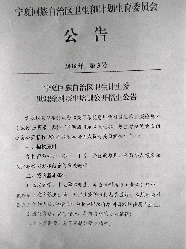 2016寧夏回族自治區(qū)衛(wèi)生計生委助理全科醫(yī)生培訓招生公告【招50人】
