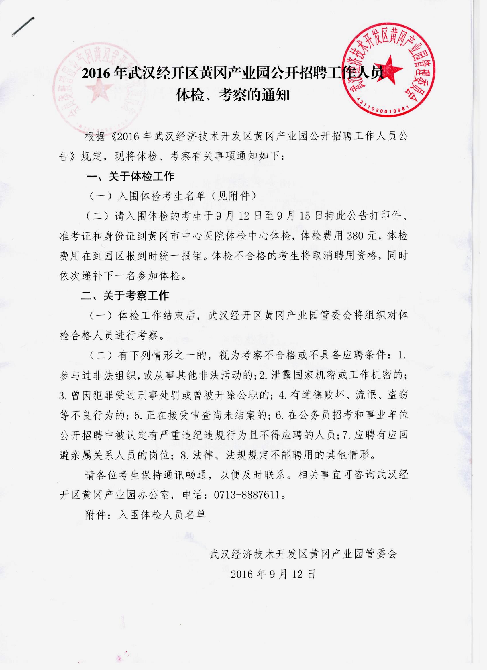 原標題:2016年武漢經(jīng)濟開發(fā)區(qū)黃岡產(chǎn)業(yè)園管委會招聘工作人員入體檢、考察的通知