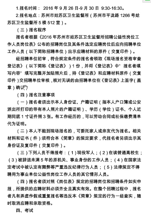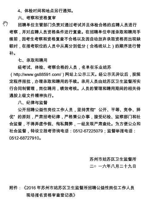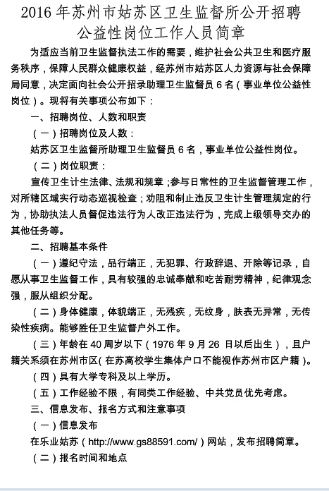 2016江蘇蘇州市姑蘇區(qū)衛(wèi)生監(jiān)督所招聘公益性崗位人員公告【招6人】
