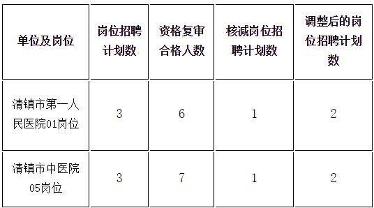 清鎮(zhèn)市2016年衛(wèi)生系統(tǒng)公開招聘事業(yè)單位工作人員資格復(fù)審工作已結(jié)束。按照《清鎮(zhèn)市2016年衛(wèi)生系統(tǒng)公開招聘事業(yè)單位工作人員簡(jiǎn)章》中“通過資格復(fù)審人數(shù)與崗位招聘計(jì)劃數(shù)之比達(dá)不到3?1的,減少該崗位招聘計(jì)劃數(shù)(例:某崗位招聘計(jì)劃數(shù)為2,通過資格復(fù)審人數(shù)為4或5,則該崗位招聘計(jì)劃數(shù)減少為1,依此類推)”的規(guī)定,現(xiàn)將清鎮(zhèn)市第一人民醫(yī)院01崗位、清鎮(zhèn)市中醫(yī)院05崗位招聘計(jì)劃數(shù)調(diào)整如下: