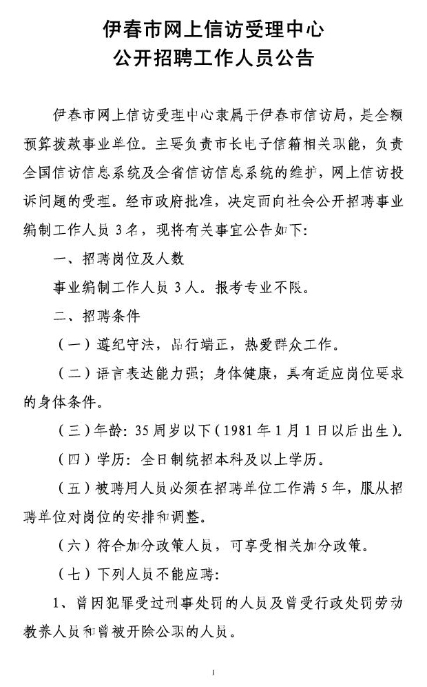 2016黑龍江伊春市網(wǎng)上信訪受理中心招聘公告【招3人】