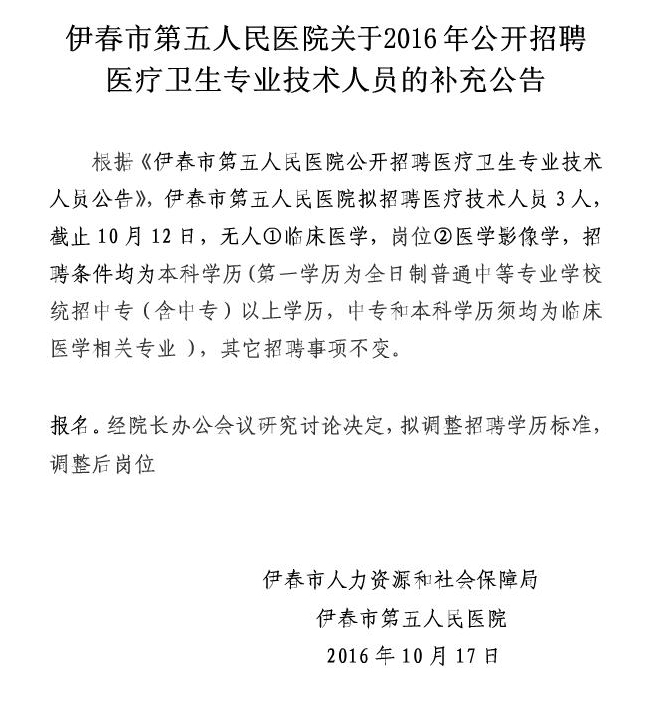 原標題:伊春市第五人民醫(yī)院關(guān)于2016年公開招聘醫(yī)療衛(wèi)生專業(yè)技術(shù)人員的補充公告