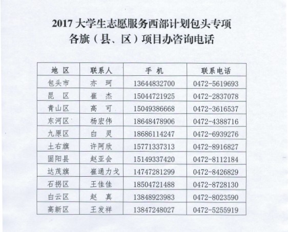 關于西部計劃包頭市地方項目報名,只要符合內蒙古大學生志愿服務西部計劃地方項目招募條件(詳見實施方案預通知),沒有在大學生志愿服務西部計劃官方網站上報名或報名后未通過高校審核的,也可直接致電包頭市各旗縣區(qū)項目辦報名參加考試。