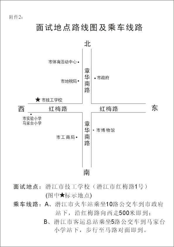 考生按照《面試準(zhǔn)考證》上的規(guī)定,應(yīng)于2017年11月25日上午7:30前到達(dá)潛江市技工實(shí)驗(yàn)樓四樓候考室報(bào)到,遲到者視為自動(dòng)棄權(quán),取消面試資格。(潛江市紅梅路1號(hào),面試地點(diǎn)路線圖及乘車線路見(jiàn)附件2)