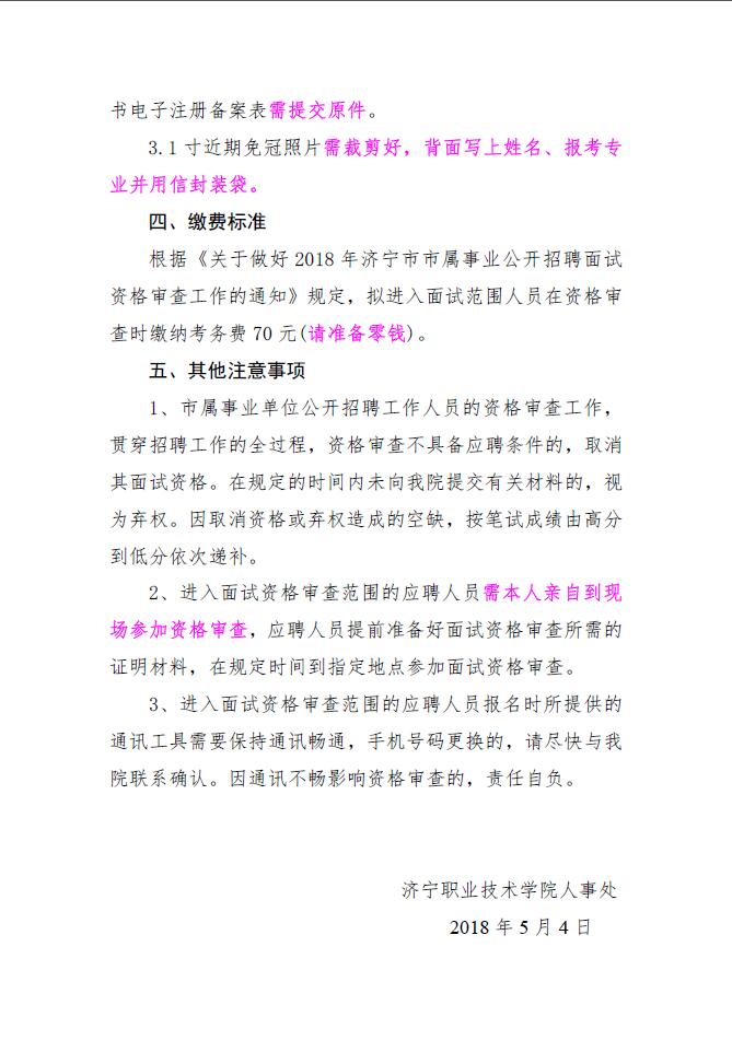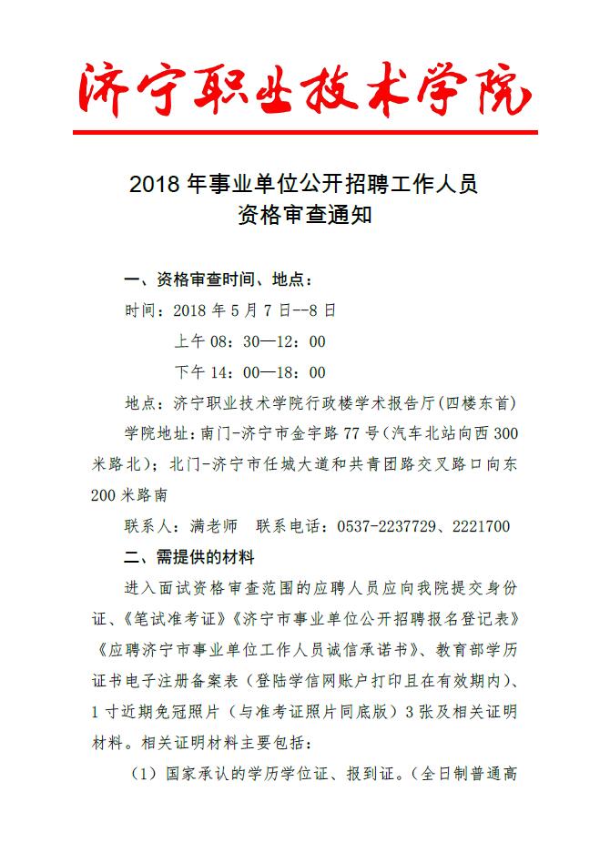 2018山東濟(jì)寧職業(yè)技術(shù)學(xué)院事業(yè)單位招聘人員資格審查通知