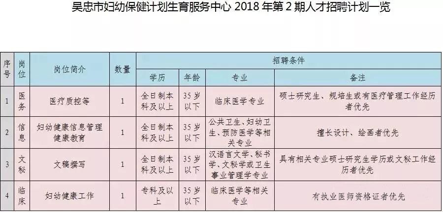 我中心2018年第2期公開招聘備案編制人員4名,具體招聘崗位、人數(shù)詳見《吳忠市婦幼保健計劃生育服務(wù)中心2018年第2期人才招聘計劃一覽表》