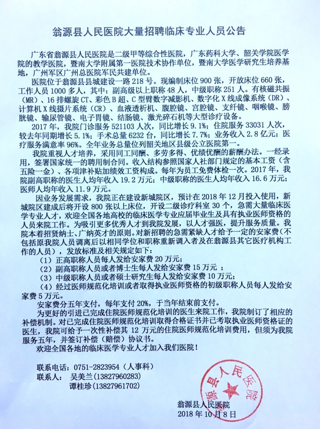 2018廣東韶關(guān)市翁源縣人民醫(yī)院大量招聘臨床專業(yè)人員公告