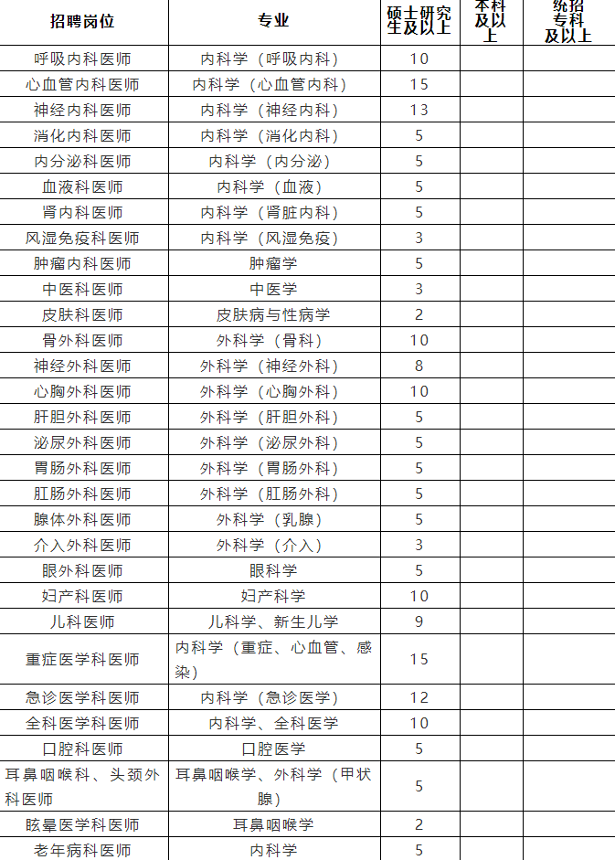 四、有工作經(jīng)歷者,醫(yī)療、醫(yī)技專業(yè)要求具有三甲醫(yī)院1年或二甲醫(yī)院2年及以上本專業(yè)臨床一線工作經(jīng)歷;護理專業(yè)要求具有三甲醫(yī)院2年或二甲醫(yī)院5年及以上本專業(yè)臨床一線工作經(jīng)歷,年齡35周歲以下。