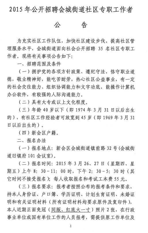 2015年廣東省江門新會區(qū)會城街道社區(qū)工作者招聘35人公告