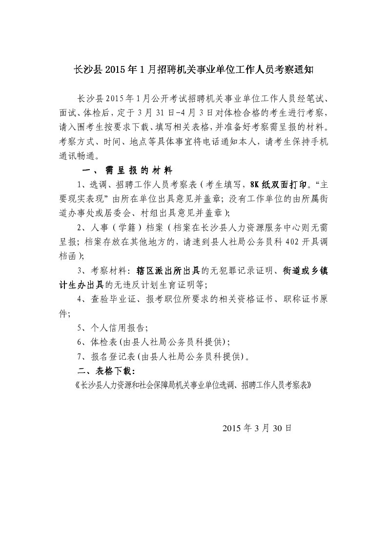 2015年1月湖南省長(zhǎng)沙縣機(jī)關(guān)事業(yè)單位招聘考察通知