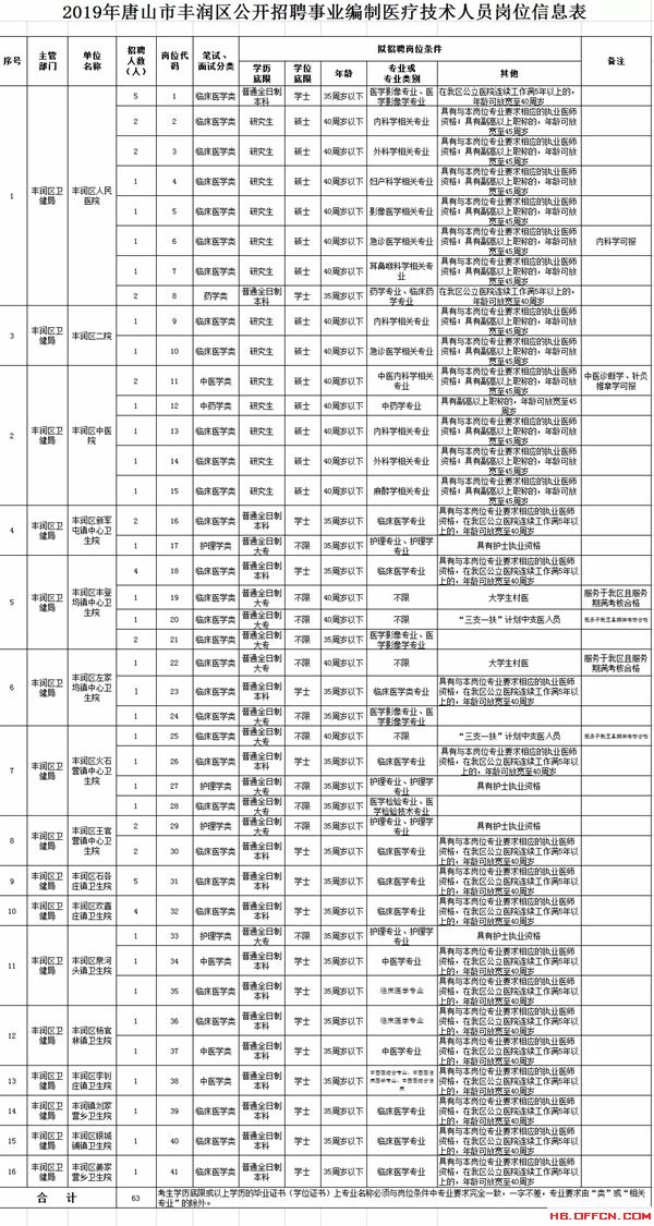 本次公開招聘事業(yè)編制醫(yī)療技術人員63名,具體崗位、人數(shù)及條件要求詳見《唐山市豐潤區(qū)2019年公開招聘事業(yè)編制醫(yī)療技術人員崗位信息表》。招聘采取統(tǒng)一招聘方式。筆試、面試考務工作,由豐潤區(qū)公開招聘事業(yè)單位工作人員領導小組辦公室委托第三方考試機構組織實施。