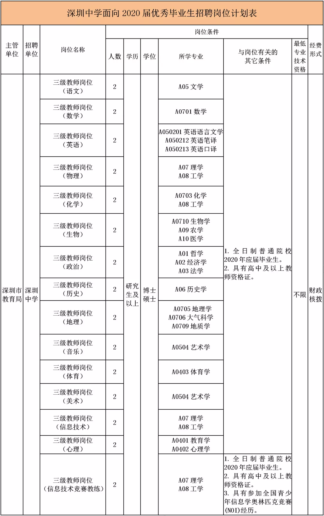 2019年9月廣東深圳中學面向2020屆畢業(yè)生赴外定點(校招)招聘教師30人公告