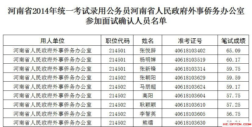 根據(jù)省委組織部、省人力資源和社會廳、省公務(wù)員局2014年統(tǒng)一考試錄用公務(wù)員工作有關(guān)規(guī)定,現(xiàn)將河南省人民政府外事僑務(wù)辦公室面試資格確認(rèn)有關(guān)事宜通知如下: