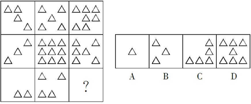76.從所給的四個(gè)選項(xiàng)中,選擇最合適的一個(gè)填入問號處,使之呈現(xiàn)一定的規(guī)律性。