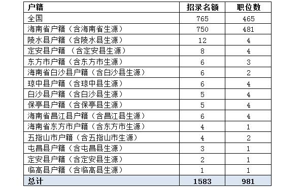 本次考試半數(shù)以上的職位對考生的戶籍進(jìn)行了設(shè)定,818個名額、516個職位需為海南省內(nèi)戶籍(含海南省生源),而且部分職位具體到某個縣,占到總計劃名額的52.6%,此外,也有765個名額、465個職位不限制戶籍,全國人民都有機會在海南實現(xiàn)自己的成“公”夢想。