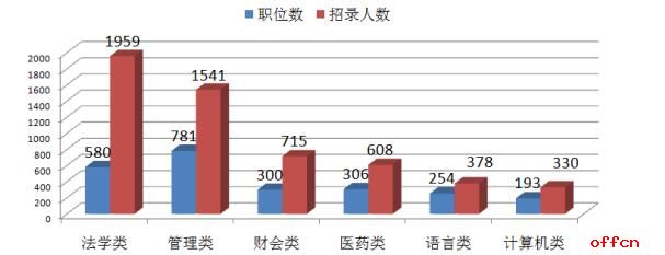 本次考試共有905個(gè)職位不限專業(yè),占總職位數(shù)的20%,與去年一樣。不限專業(yè)職位共招錄1709人,占總招錄人數(shù)的26%,略低于去年的30%。據(jù)中公網(wǎng)校統(tǒng)計(jì),本次考試最熱門的六大專業(yè)為法學(xué)類、管理類、財(cái)會(huì)類、醫(yī)藥類、語(yǔ)言類、計(jì)算機(jī)類。
