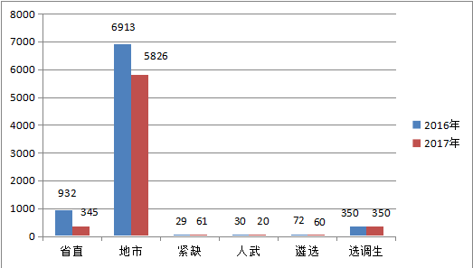 2017年浙江省公務(wù)員考試的招錄人數(shù)呈現(xiàn)遞減趨勢,但是,今年也有增加,如殘疾人招錄人數(shù)增加、公務(wù)員遴選與省考同步進(jìn)行、選調(diào)生數(shù)量不變等等。具體如下圖:
