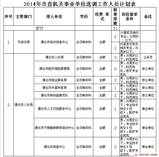 2014年吉林通化市直機關(guān)事業(yè)單位選調(diào)工作人員計劃
