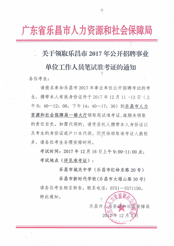 2017廣東韶關(guān)樂昌市事業(yè)單位招聘筆試準考證領(lǐng)取通知